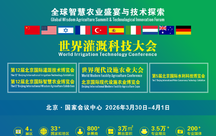 第12届北京国际数字农业与灌溉技术博览会暨世界灌溉科技大会,将于2026年3月30日至4月1日在北京·国家会议中心举行。作为世界三大灌溉展之一,大会将集中展示智能灌溉、数字农业、设施农业、水肥一体化等全产业链技术,同期举办世界现代设施农业大会、第五届北京国际水利科技博览会、区域高标准农田发展交流会。大会也将同期举办的高端论坛将邀请院士、政策制定者及行业领袖,解读“十五五”政策趋势,发布前沿技术成果。